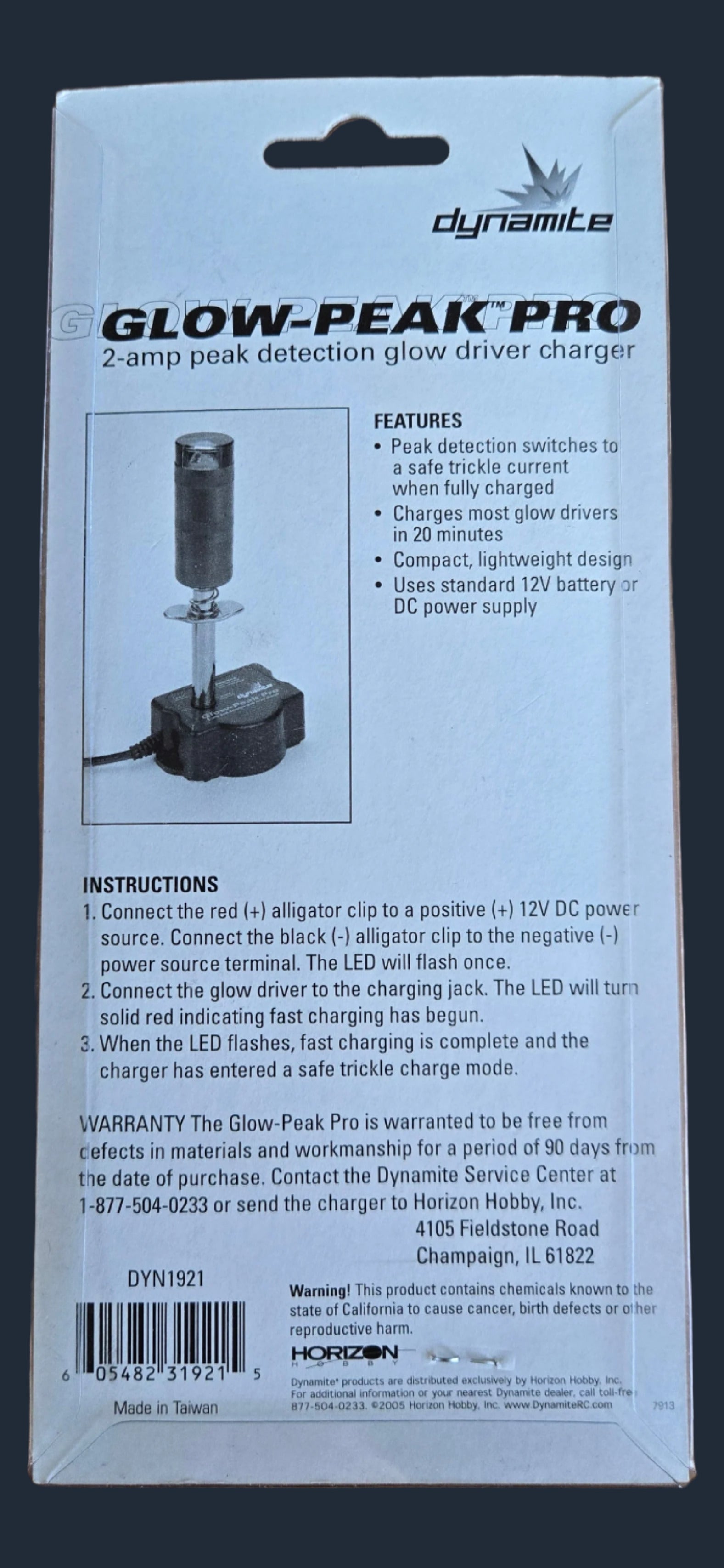 Peak detection switches to a safe trickle current when fully charged Charges most glow drivers in 20 minutes Compact, lightweight design Uses standard 12V battery or DC power supply.