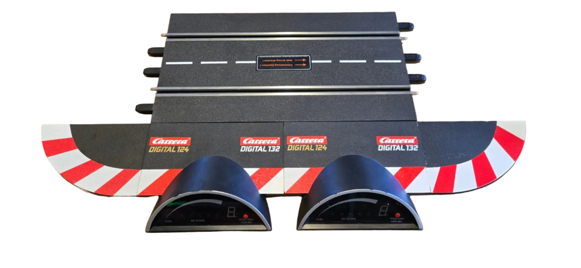 With digital features, the racing action you will enjoy with your slot car race track will be further enhanced. The Driver Display is one of these cool accessories for the Carrera DIGITAL 124 and DIGITAL 132 that not only gives your race track a visual highlight, but also score points with its exciting functions. In conjunction with the Control Unit (30352) and the Pit Lane (30356), the LED Display shows you not only the current race position, but also the tank capacity, rpm and the number of pit stops. With this information, you now have much more leeway to incorporate tactical skill into your driving and to finish top of the podium when you cross the finish line. The Driver Display comes with an adapter on a scale of 1:24 and two connecting track sections.